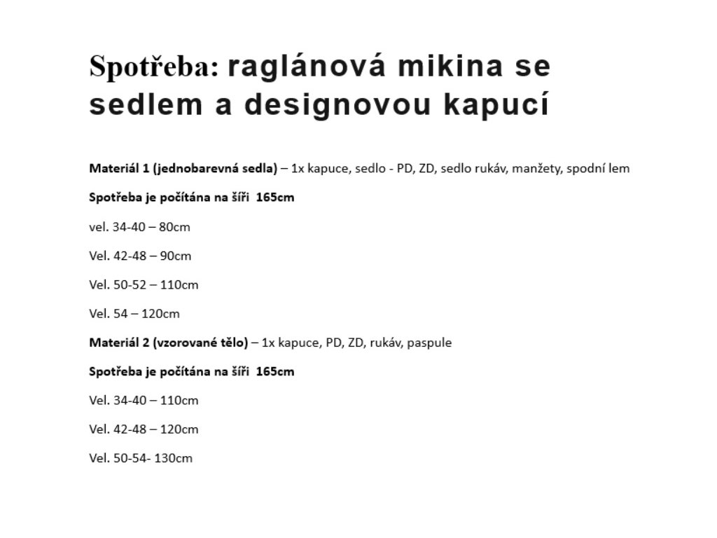 | Celková spotřeba látky vel. 38: | 135 cm, šíře 165 cm |