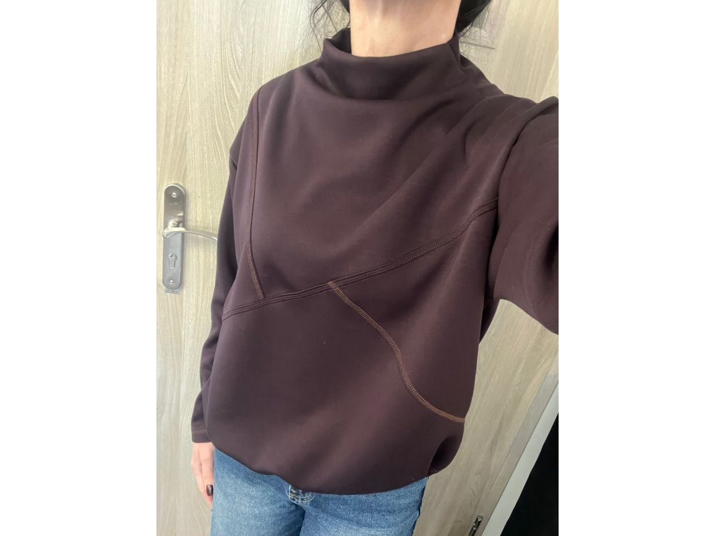 Střih je navržený výhradně pro pružné, splývavé materiály, aby mikina hezky seděla, jemně padala a byla příjemná na nošení. Stojáček působí elegantně, přitom je komfortní a nijak neškrtí.