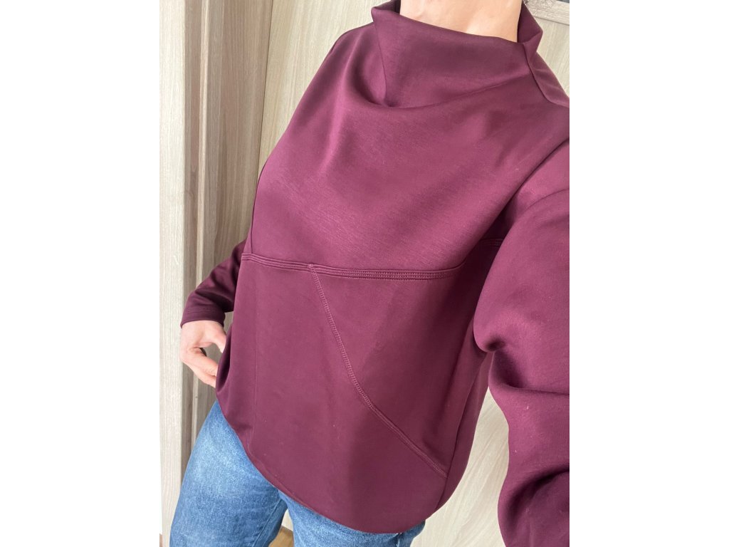 Střih je navržený výhradně pro pružné, splývavé materiály, aby mikina hezky seděla, jemně padala a byla příjemná na nošení. Stojáček působí elegantně, přitom je komfortní a nijak neškrtí.