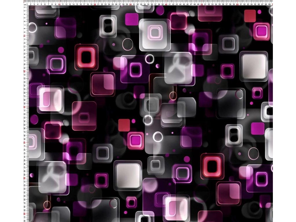 Motiv zářivých čtverců a kruhů v odstínech růžové, fialové, šedé a bílé na černém pozadí působí jako hra světel a odrazů – elegantně i futuristicky.
