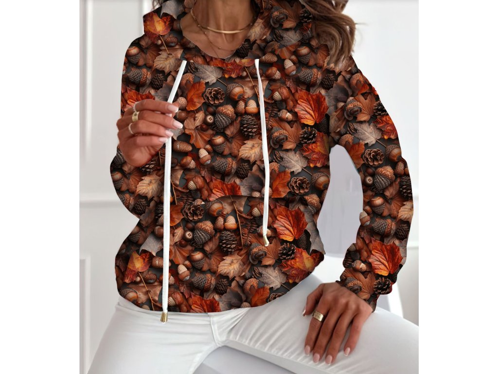 Teplákovina s realistickým motivem listí, žaludů a šišek zachycuje dokonalou atmosféru podzimu.