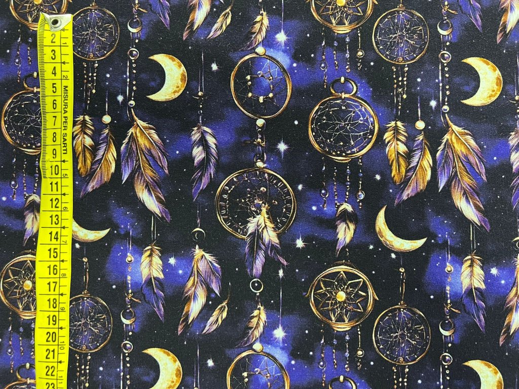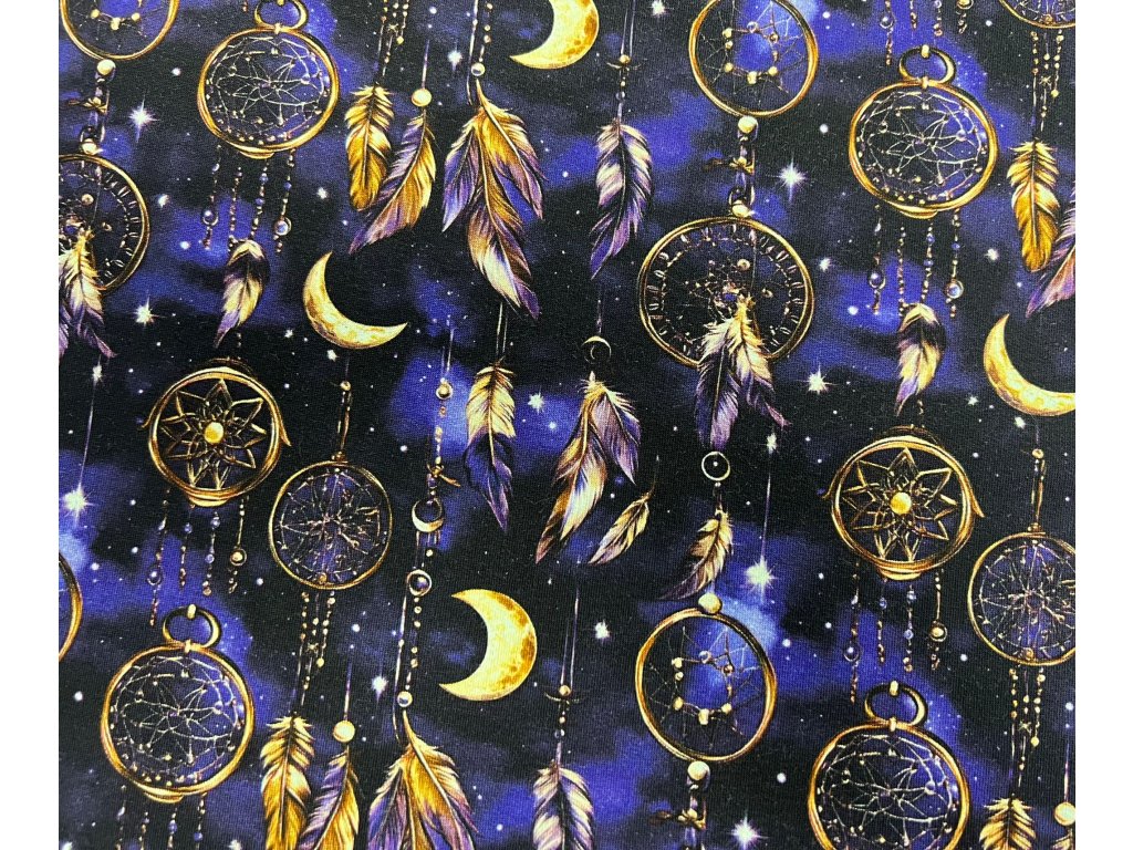 Přeneste se do světa snů s naším jedinečným vzorem zlatých lapačů na božsky fialovém úpletu. Tento harmonický a okouzlující design jsme natiskli na velmi pohodlný úplet, který pruží a příjemný na nošení.
