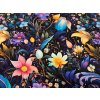 Úplet s detailním květinovým vzorem na tmavém podkladu. Motiv tvoří bohaté květy v odstínech růžové, fialové, světle modré a krémové, doplněné jemnými lístky a pupeny, které dohromady vytvářejí romantický a elegantní design. Materiál je pružný, měkký a příjemný na tělo, vhodný na trička, šaty, tuniky či sukně.