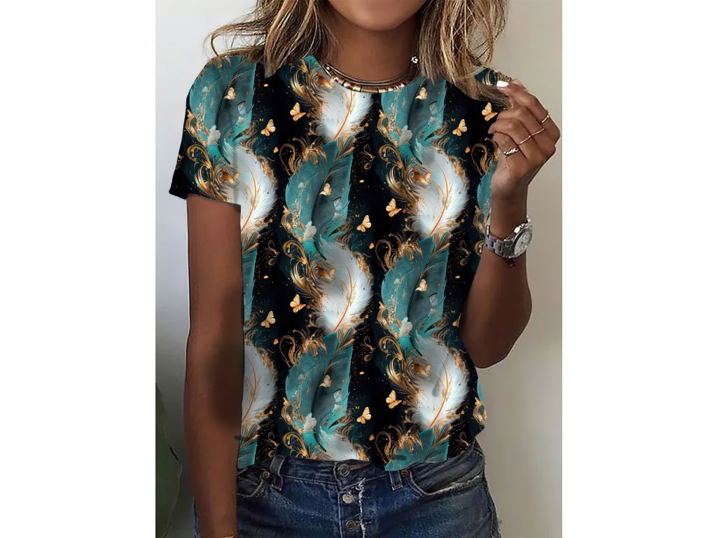 Motiv zlatých peříček a drobných motýlů vyniká na temném, kontrastním pozadí tónů petrolejové, černé a zlaté, díky čemuž působí vzor živě a exkluzivně.