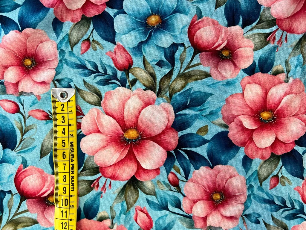 Tento vzor s krásnými růžovými květy na modré je ideální pro letní outfity plné energie a svěžesti. Nádherný design je perfektní pro šití rozverných letních šatiček, ale i pro pohodlná upnutá trička a tílka. Tento vzor přináší do vašeho šatníku jemnost, eleganci a hravost, která vás bude provázet horkými dny plnými slunce.